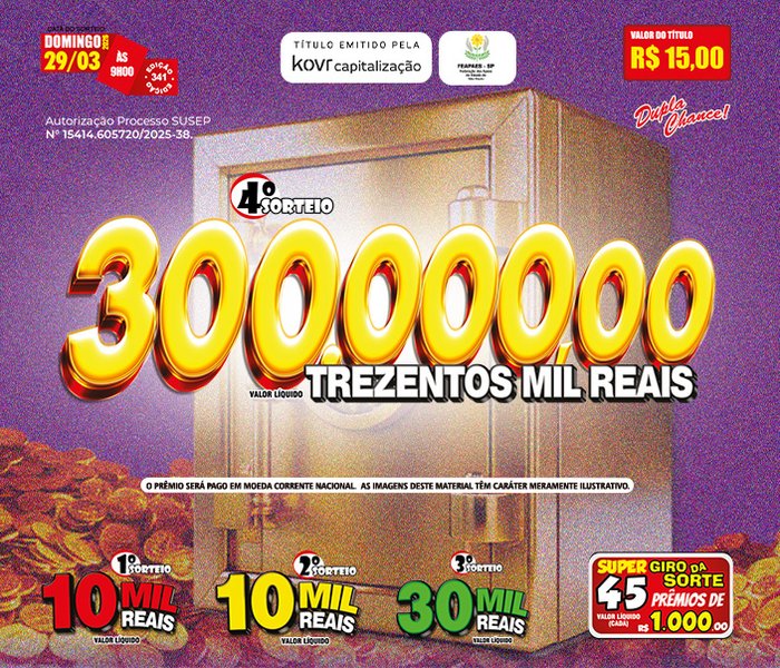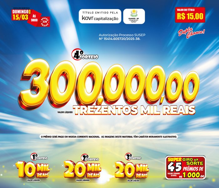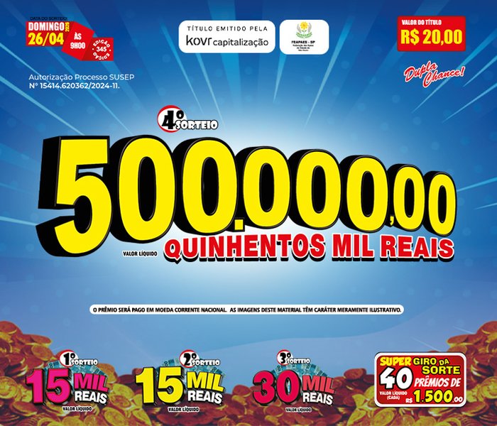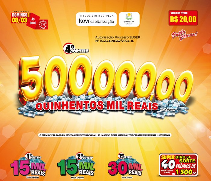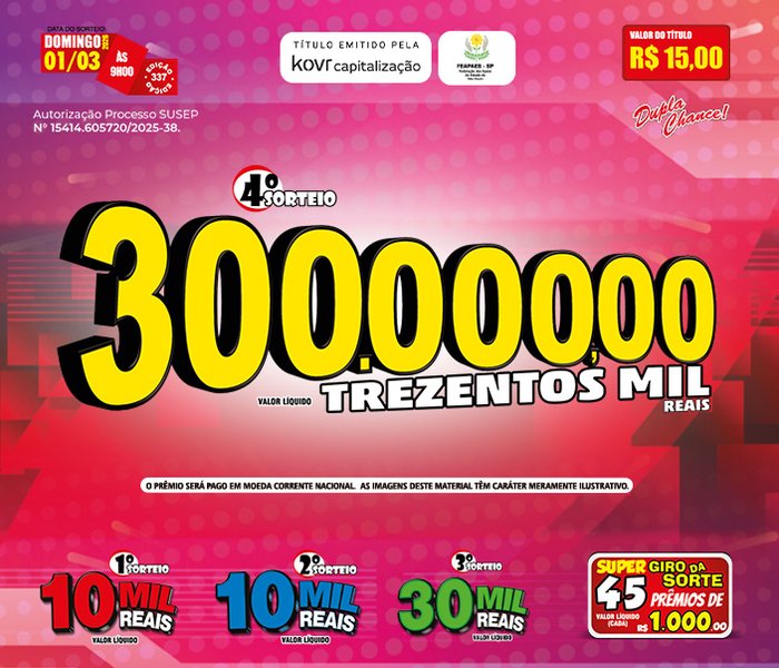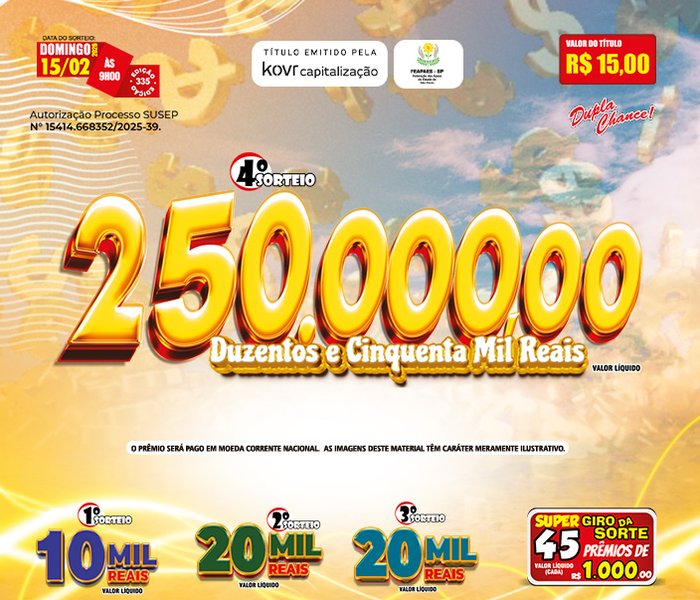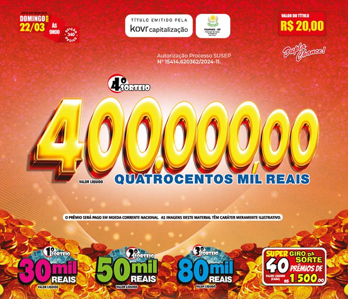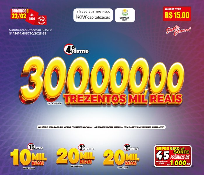 Sorteios realizado aos Domingos, às 09h00, ao vivo através da TV Band e You Tube.