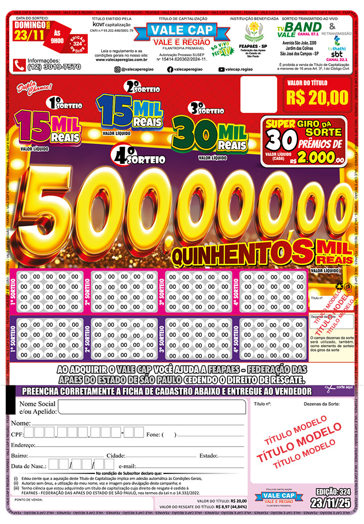 Além de concorrer a valiosos prêmios, você ajuda a FEAPAES-SP (Federação das APAES do Estado de São Paulo), cedendo o direito de resgate do título.