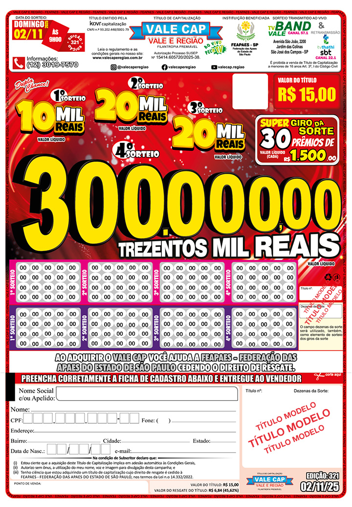 Além de concorrer a valiosos prêmios, você ajuda a FEAPAES-SP (Federação das APAES do Estado de São Paulo), cedendo o direito de resgate do título.