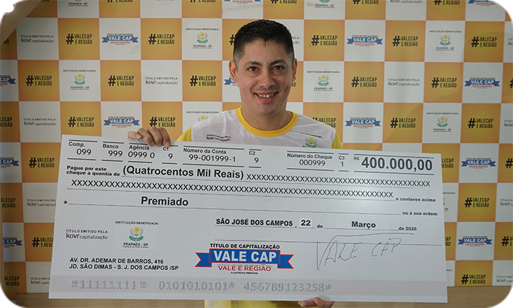 O segundo ganhador foi o Thiago, da cidade de Cubatão. Realize seus sonhos e mude de vida comprando o título de capitalização filantropia premiável Vale Cap em um dos pontos de venda espalhados por toda a região do Vale do Paraíba, ou pelo aplicativo para smartphones, Android e iOS.